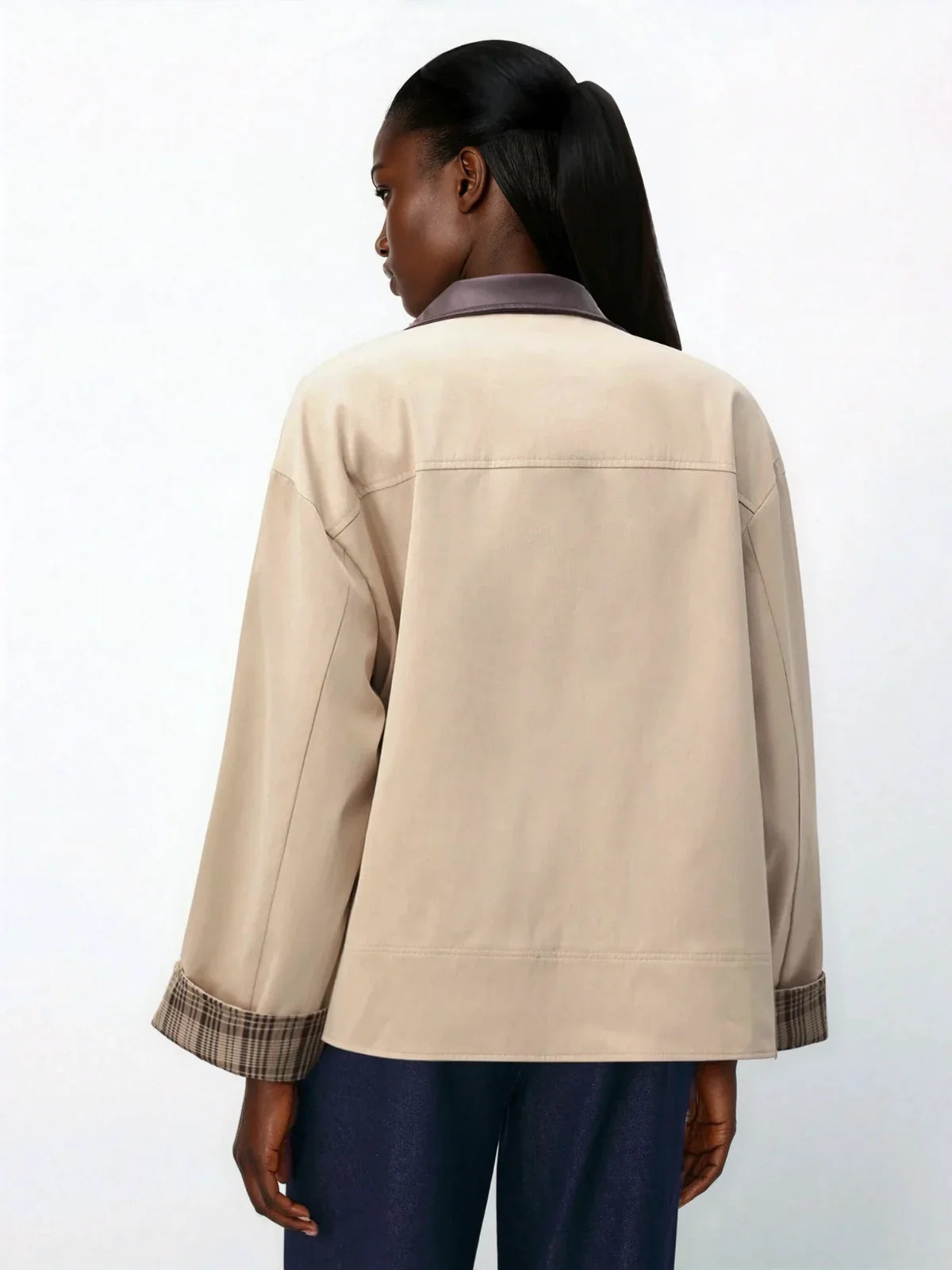 Brown Plaid Patchwork Sleeve Blazer With Leather Collar For Women Winter Everyday Wear (Boyut)